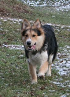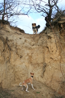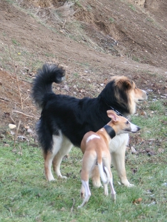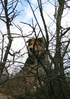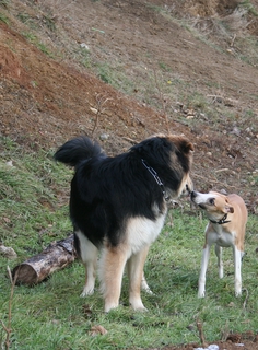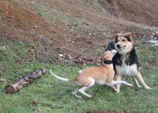 … und dann gibt’s da noch die idealen Spielgefährten schlechthin – wie z.B. Elvis, einen hübschen Mischling (Mutter: weißer Schäferhund, Vater wahrscheinlich irgendwas in die Richtung Berner Sennenhund!). Mit Elvis, der noch genauso jung und verspielt war wie Marley selbst, war ein toller Spielpartner gefunden – da er als Laufpartner dann doch zu langsam war, haben die beiden eben im steilen, buschigen Gelände Verstecken gespielt – aber auch hier war Marley natürlich der Flinkere und hatte gewisse Vorteile 🙂 – Spass hatten aber auf jeden Fall beide!