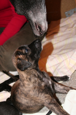 Letzten Sonntag hat mich Marta (Balifail Whippets) eingeladen, die damals 4 nun schon 5 Wochen alten Welpen aus dem B-Wurf zu besuchen. Na, da war ich dann doch ziemlich überrascht, wie weit sich die Kleinen schon entwickelt hatten; ich hatte sie ja zuletzt nur 3 Tage alt gesehen, im Meerschweinchen-Stadium sozusagen, ;-) und nun waren sie nicht nur um vieles gewachsen, sondern kamen auch gleich alle flott auf mich zugewackelt und zerrten am Pullover bzw. versuchten an mir hochzuklettern.